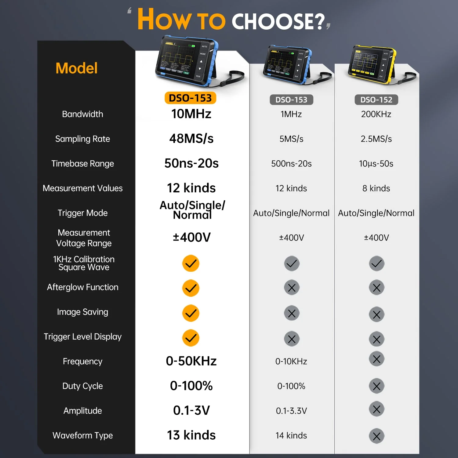 - DSO oscilloscope: 48MS/s, 10MHz bandwidth, ±400V voltage range.
